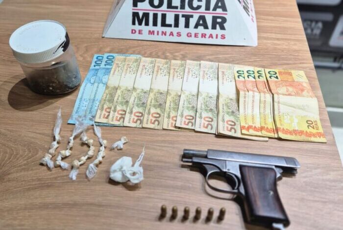 Após denúncias indicando que armas e drogas estariam sendo armazenadas em uma residência, equipes policiais deslocaram ao local e perceberam um forte odor de maconha. Diante da fundada suspeita, foi realizada a abordagem, resultando na apreensão de uma pistola calibre 635 mm, seis munições, 28 pedras de crack, uma porção de cocaína, um pote com maconha e uma quantia em dinheiro.