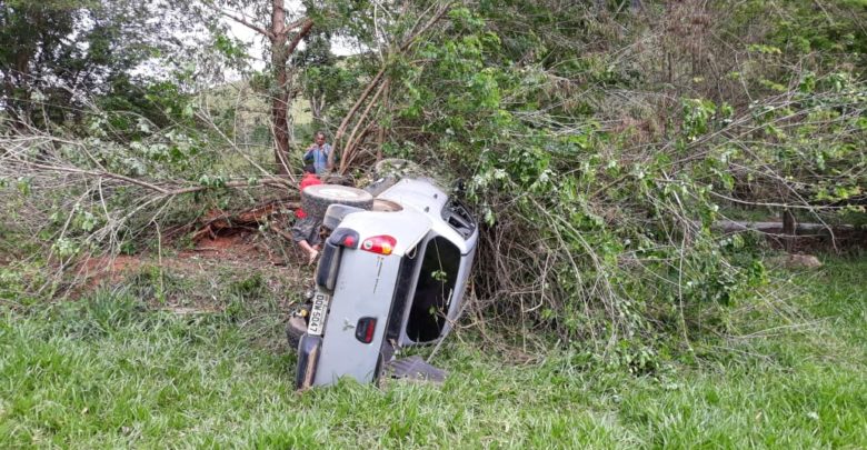 O veículo parou tombado após bater numa área de vegetação.