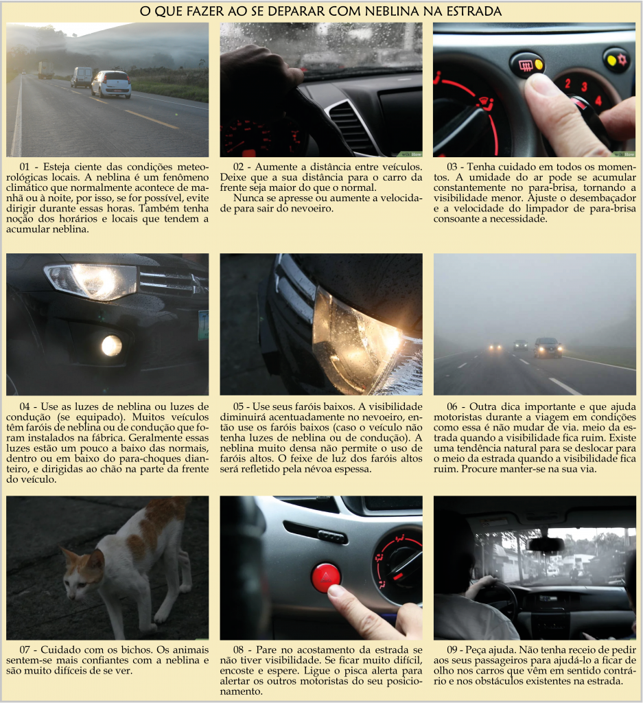 tenha distância segura do veículo a sua frente maior que em situação de maior visibilidade, pois, em caso da necessidade de frenagem repentina, não lhe falte espaço para imobilizar o seu veículo evitando uma colisão”, acrescentou o PRF.