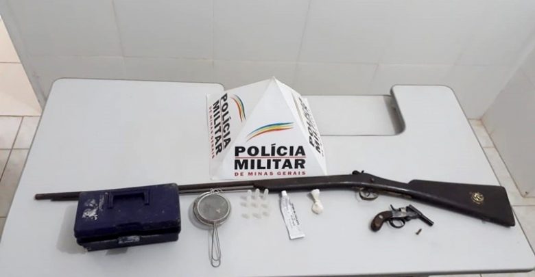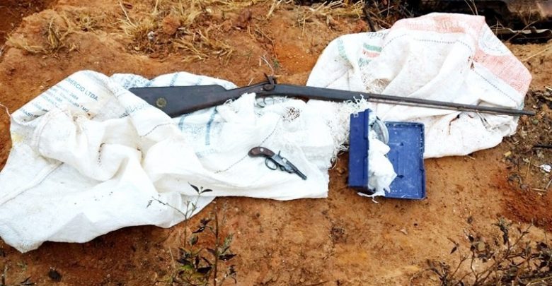 Os militares deslocaram-se até o local da denúncia, onde perceberam que em determinado ponto daquela área, havia vestígios de terra recém mexida e solta. Após retirarem a referida terra, encontraram um saco plástico enterrado contendo em seu interior uma espingarda polveira, uma garrucha calibre 22, uma munição intacta de calibre 22, nove pinos de cocaína e uma porção de cocaína.