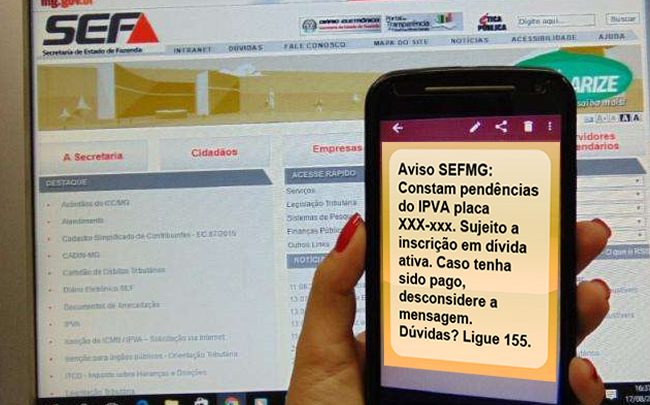 A Secretaria de Estado de Fazenda de Minas Gerais (SEF) encaminhou nesta segunda-feira mensagens de texto de celular para 800 mil devedores do Imposto sobre Propriedade de Veículos Automotores (IPVA), alertando para o não pagamento do tributo deste ano e/ou de exercícios anteriores. O montante devido é de R$ 704 milhões. De acordo com o chefe da Administração Fazendária (AF) de Manhuaçu, Fabricio Bicalho, é fundamental observar que a mensagem não contém link, apenas o texto. Ele reitera que a mensagem também deve ser desconsiderada caso quem a recebeu não possua mais o veículo.