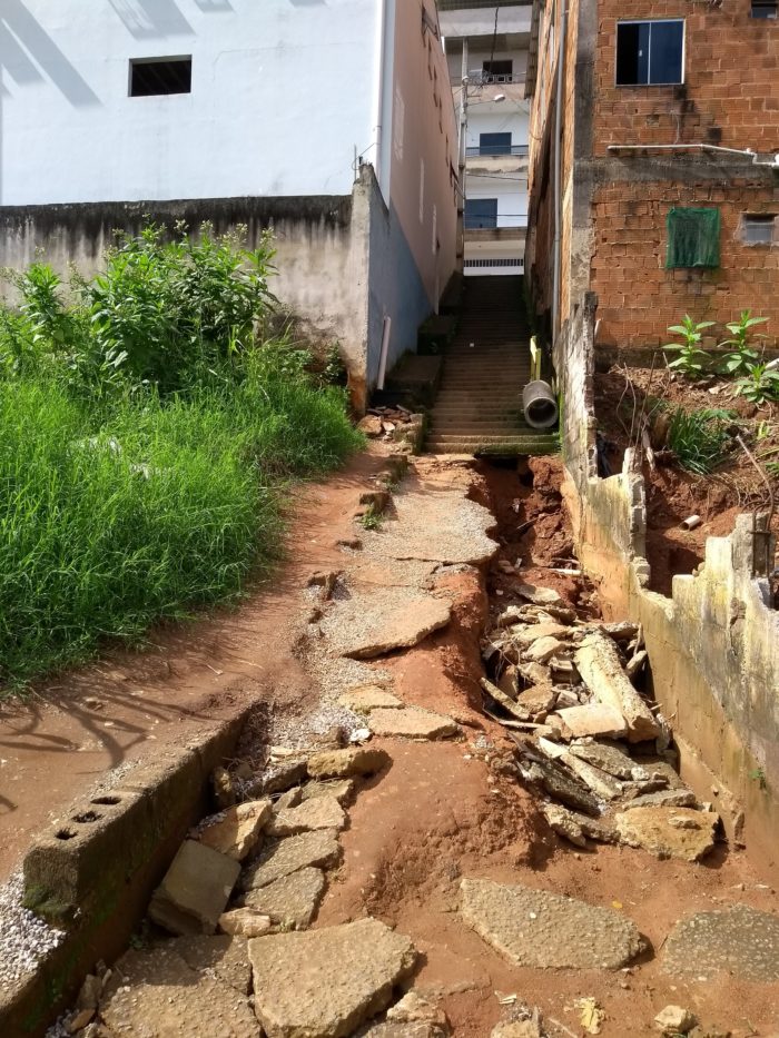 Desde o início de janeiro deste ano, a escadaria Alfredo Damasceno (B. Nossa Senhora Aparecida), em Manhuaçu, foi completamente danificada pela enxurrada, que destruiu toda a estrutura de passagem de pedestres. Com isso, os moradores tem encontrado dificuldade para terem acesso ao Posto de Saúde (ESF), e residências que ficam acima da cratera.