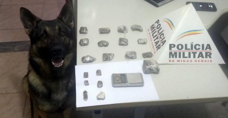 No local, foi aplicado o cão de faro Aquiles que indicou um ponto mais precisamente próximo de uma árvore, que ao ser verificado foram localizados 19 tabletes de maconha e 01 balança de precisão.