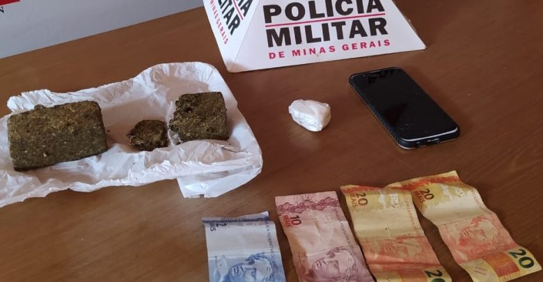 Foi montada uma operação de cerco e bloqueio sendo o veículo abordado no Córrego Areado e durante as buscas foram localizadas 02 barras e 01 porção de maconha, 01 invólucro contendo cocaína e R$ 52,00.