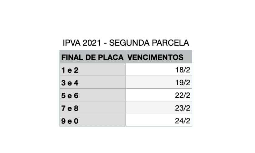 Começa nesta quinta-feira (18/2) a escala de vencimentos da segunda parcela do Imposto sobre a Propriedade de Veículos Automotores (IPVA) 2021 para os veículos e motocicletas licenciados em Minas Gerais. A ordem tem início com as placas de final 1 e 2 e segue sempre com dois finais de placa por dia, até 24 de fevereiro, se encerrando com os dígitos 9 e 0.