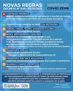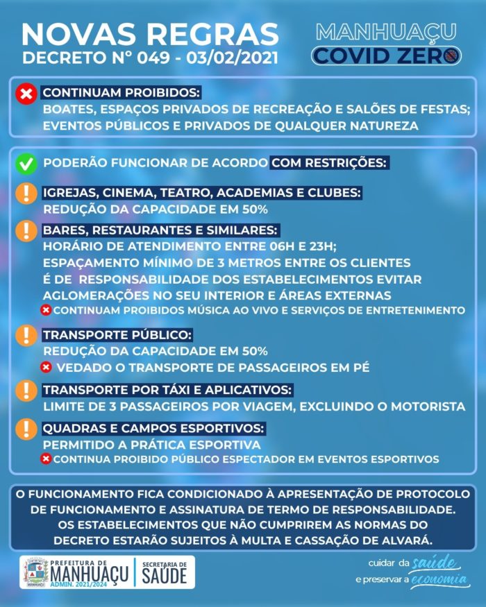 A Prefeitura de Manhuaçu publicou nesta quarta-feira (03) um novo decreto sobre o funcionamento do comércio no município. O documento foi criado a partir das orientações do programa do governo do estado, o Minas Consciente, que flexibilizou o funcionamento do comércio em todas as ondas. O decreto destaca que é de responsabilidade do proprietário impedir a aglomeração de pessoas dentro e fora do estabelecimento.