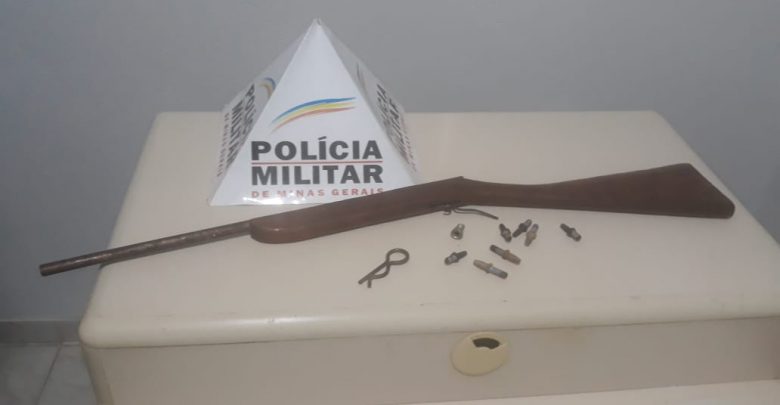 Ao chegarem no local, a equipe avistou uma espingarda pendurada na parede da cozinha. Em contato com o denunciado, de 27 anos, ele disse ter ganhado a arma de um colega há um tempo e a entregou aos militares.