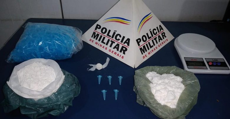 No local foi feito contato com o denunciado e durante as buscas foram localizados no quarto do autor 02 porções e 01 papelote de cocaína, 01 balança de precisão e diversos materiais para embalar as drogas.
