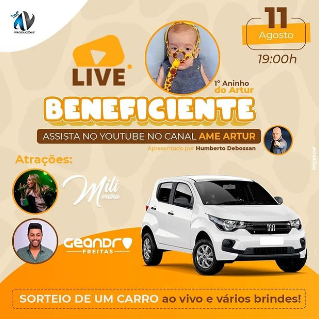 Acontece hoje a partir das 19 horas a live beneficente em prol do pequeno Artur. Rifas ainda estão sendo vendidas e além de ajudar nessa causa tão nobre, ainda pode concorrer a um carro 0Km.
