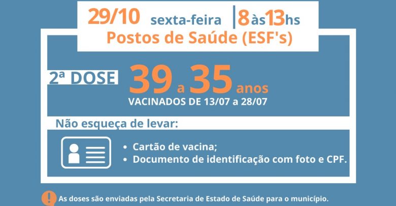 Nesta sexta-feira (29) será a aplicação da segunda dose da vacina contra a Covid-19 para as pessoas de 39 e 35 anos. Serão vacinados aqueles que receberam a primeira dose da Pfizer entre os dias 13 e 28 de julho, sendo indispensável a apresentação do cartão de vacina e um documento com foto e CPF.