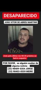 A família do jovem João Vitor, conhecido como o filho do Jorge Barbosa Martins, conhecido como “Jorge do Açougue”, pede a colaboração da população para achar auxiliar no seu encontro.