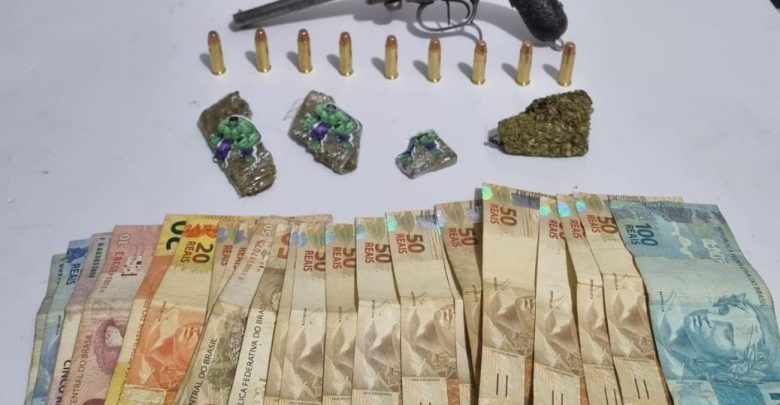 No local foi feito contato com o denunciado e durante as buscas foram localizadas 01 arma de fogo, tipo garrucha calibre 38, 09 munições intactas do mesmo calibre, 03 tabletes e 01 barra de maconha, além de R$961,00 em dinheiro.