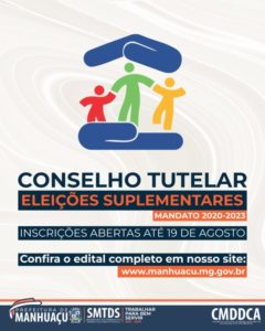Estão abertas até o dia 19 de agosto, as inscrições para quem deseja atuar como Conselheiro Tutelar de Manhuaçu. O órgão é responsável por zelar pelo cumprimento dos direitos da criança e do adolescente, definidos no Estatuto da Criança e do Adolescente (ECA).