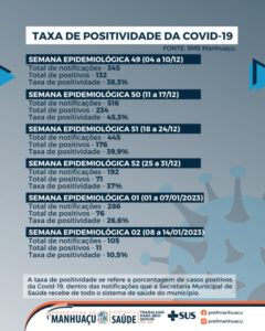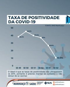 Os casos da Covid-19 em Manhuaçu, apresentaram uma leve queda. Na segunda semana epidemiológica de 2023, a de número 02, foram confirmados 11 casos da doença, representando uma taxa de positividade de 10,5%, dentro das 105 notificações. Lembrando que o ideal é que essa taxa esteja sempre abaixo de 20%, para que o sistema de saúde não fique sobrecarregado, podendo assim fazer um atendimento eficaz e pleno para todos.