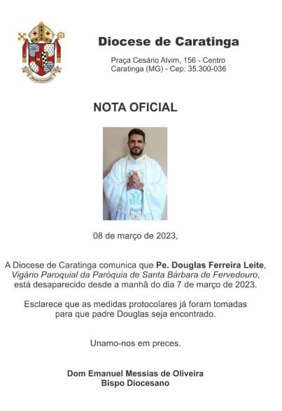 A nota divulgada ontem à noite, assinada pelo Bispo Dom Emanuel Messias de Oliveira, informa que as medidas protocolares já foram tomadas, para que padre Douglas seja encontrado como a comunicação de desaparecimento à Polícia Civil de Muriaé, e pedindo orações a toda a comunidade para que ele seja encontrado.