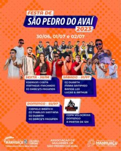 Fechando a festa de São Pedro do Avaí, tem o Grupo Chinelo Branco e os Dj’s Marlon Santana, Duarth e Darcys Fagunds, que se apresentam no domingo (02). No mesmo dia, a partir das 8 da manhã, tem Copa Velocross.