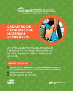 A Prefeitura de Manhuaçu, por meio da Secretaria Municipal do Trabalho e Desenvolvimento Social, convoca os catadores de recicláveis para se cadastrarem no CRAS até o dia 07 de julho. O objetivo é realizar um mapeamento para que o executivo possa pensar e estabelecer políticas públicas para este setor.