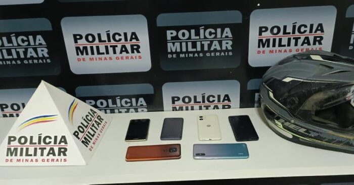 Autor de 26 anos foi preso em flagrante pela Polícia Militar pelo crime de roubo, e a motocicleta utilizada no crime foi apreendida; sendo encaminhados, juntamente com os celulares para a Delegacia de Polícia Civil.