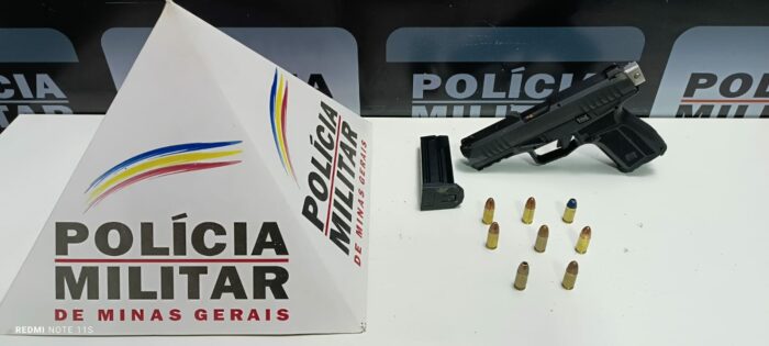 Durante rastreamento aos suspeitos, as equipes da PM localizaram o menor infrator escondido em um beco na referida rua. No mesmo beco, atrás de uma porta, foi encontrada uma arma de fogo, uma pistola calibre 9mm, carregada com 08 munições intactas.