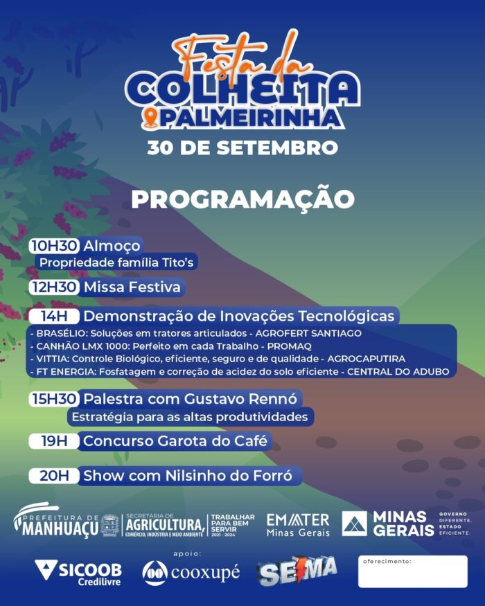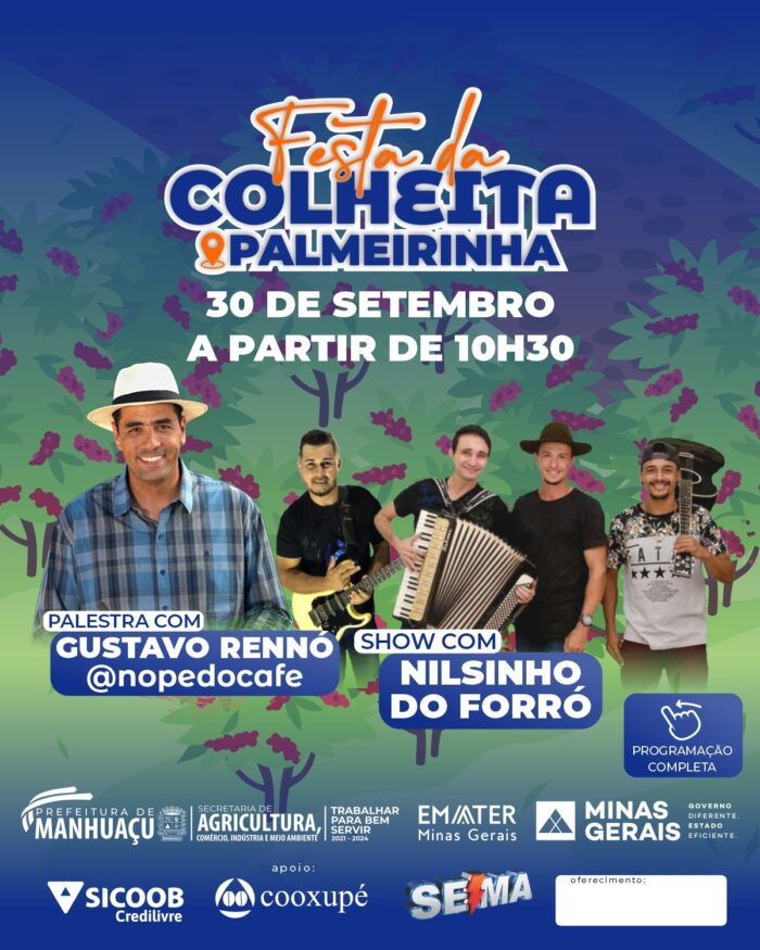 É para celebrar, confraternizar e agradecer que no próximo sábado (30), a comunidade de Palmeirinha realiza a tradicional Festa da Colheita. O evento é realizado pela Prefeitura de Manhuaçu, por meio da Secretaria de Agricultura, Comércio, Indústria e Meio Ambiente, juntamente com a Emater-MG.