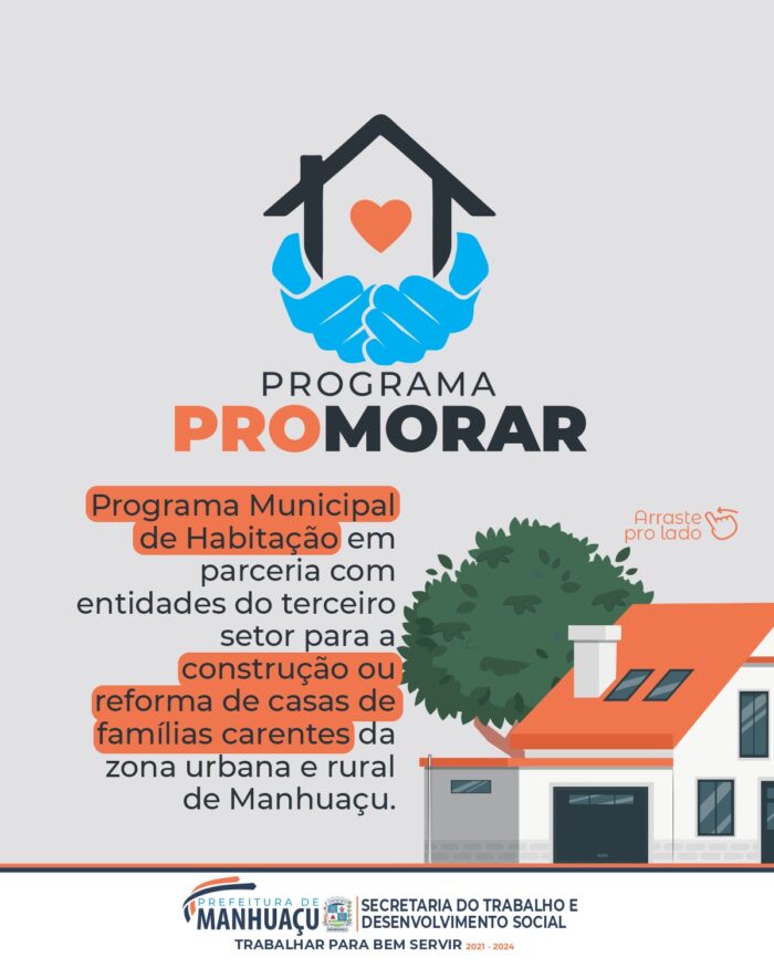 A Prefeitura de Manhuaçu, por meio da Lei Municipal nº 4.185, de 02 de dezembro de 2021, criou o Programa Promorar. Um Programa Municipal de Habitação que em parceria com entidades do terceiro setor, tem por objetivo realizar a construção ou reforma de casas para famílias carentes da zona urbana e rural de Manhuaçu.
