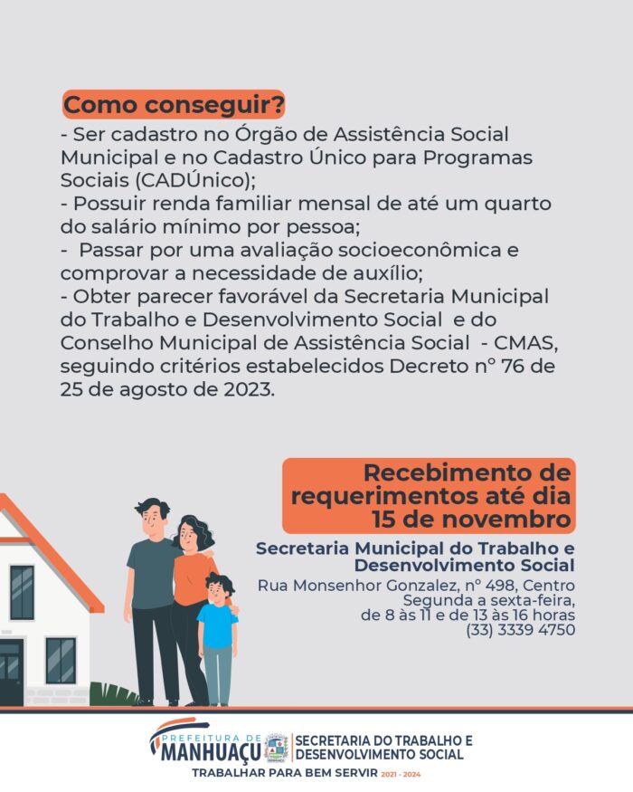 Para participar, o interessado deve estar cadastrado no Órgão de Assistência Social Municipal e no Cadastro Único para Programas Sociais (CADÚnico); possui um renda familiar mensal de até ¼ (um quarto) do salário mínimo por pessoa; passar por uma avaliação socioeconômica e comprovar a necessidade de auxílio; e obter parecer favorável da Secretaria Municipal do Trabalho e Desenvolvimento Social e do Conselho Municipal da Assistência Social – CMAS, conforme critérios estabelecidos pelo Decreto nº 76, de 25 de agosto de 2023.