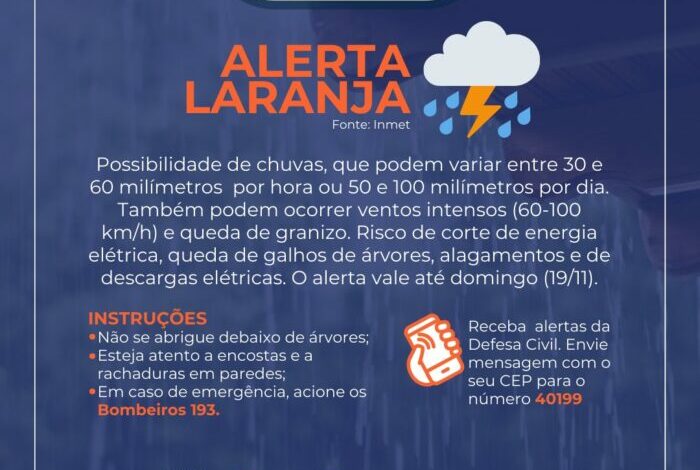 Ainda segundo o alerta do Inmet, também podem ocorrer ventos intensos (60-100 km/h, o que pode gerar corte de energia elétrica, queda de galhos de árvores, alagamentos e descargas elétricas.