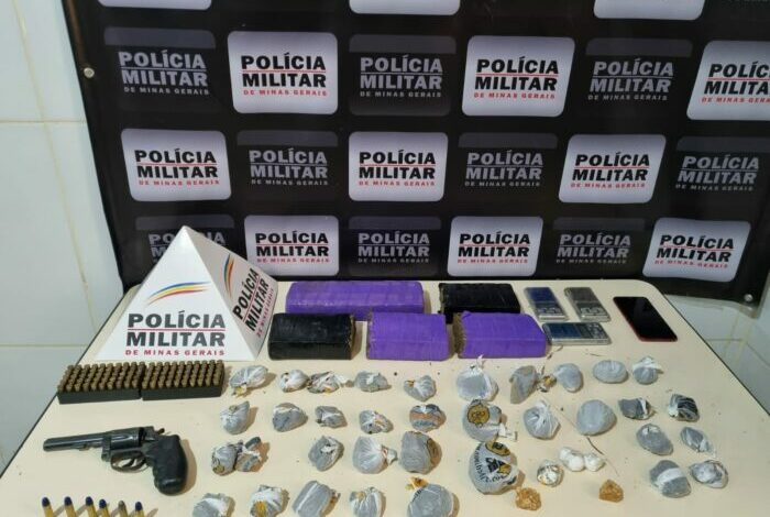 De imediato, foi acionado apoio da equipe ROCCA sendo encontrado na casa do autor mais 04 barras de maconha prensadas,35 porções de maconha, 03 porções de cocaína, 02 pedras brutas de crack, 100 munições 9mm, 06 munições de .38 e 01 revólver calibre 38, além de 01 celular e 03 balanças de precisão.
