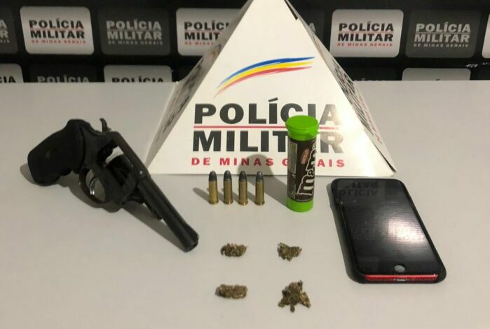 Durante as buscas foram localizados 01 revólver calibre 38, com 04 munições do mesmo calibre, 04 porções de maconha e 01 telefone celular.