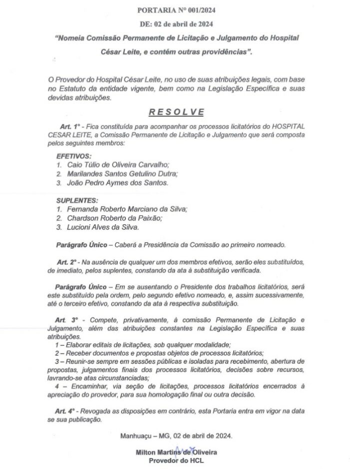 “Nomeia Comissão Permanete de Licitação e Julgamento do Hospital Cpesar Leite, e contém outras providências”
