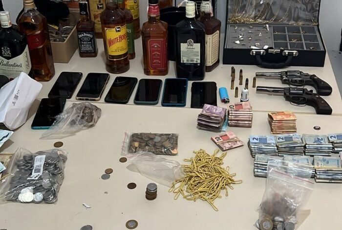 As guarnições iniciaram o acompanhamento e conseguiram abordar o veículo. Durante a revista pessoal e no automóvel, os militares encontraram uma faca, dois revólveres calibre 38, dez munições de mesmo calibre, R$ 4.253,00 em espécie, $25 dólares, 53 joias de diferentes tipos, uma placa de ouro de sete gramas, sete celulares, uma touca balaclava e um boné, além de 14 garrafas de uísque.