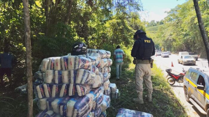 MANHUAÇU (MG) – Uma carreta carregada com arroz tombou no km 46 da BR-262, no final da manhã desta sexta-feira, 06/12. Diversas pessoas saquearam a carga espalhada na margem da rodovia. A PRF agiu rápido, recuperou parte do produto e prendeu envolvidos.