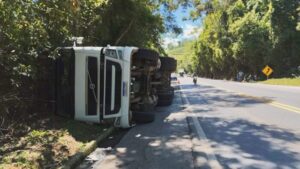 Segundo o motorista, ele seguia no sentido Realeza para Manhuaçu quando teve que desviar de um veículo na contramão. O carreteiro conseguiu sair para o acostamento e tentou parar, mas a carga puxou para um lado e tombou.
