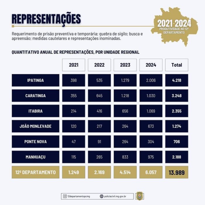 Início/Balanço do 12º Departamento de Polícia: avanços em representações, inquéritos e TCOs em Minas Gerais/04 04