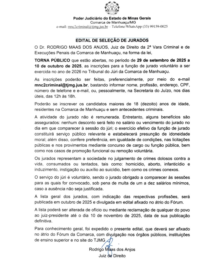 10 de outubro de 2025, as inscrições para a função de jurado voluntário a ser