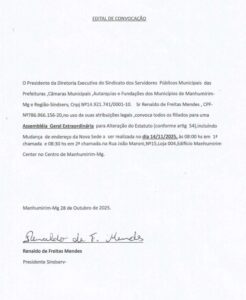 Prefeituras,Câmaras Municipais,Autarquias e Fundações dos Municípios de ManhumirimMg e Região-Sindserv, Cnpj №14.921.741/0001-10. Sr Renaldo de Freitas Mendes, CPFN786.966.156-20,no uso de suas atribuições legais,convoca todos os filiados para uma