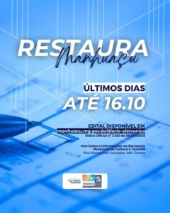A Prefeitura de Manhuaçu, por meio da Secretaria Municipal de Cultura e Turismo e do Conselho Municipal de Patrimônio Cultural (COMPAC), alerta que o prazo para inscrição no Edital de Chamamento Público nº 008/2025 – Restaura Manhuaçu está chegando ao fim. Os interessados têm até o dia 16 de outubro de 2025 para apresentar suas propostas.