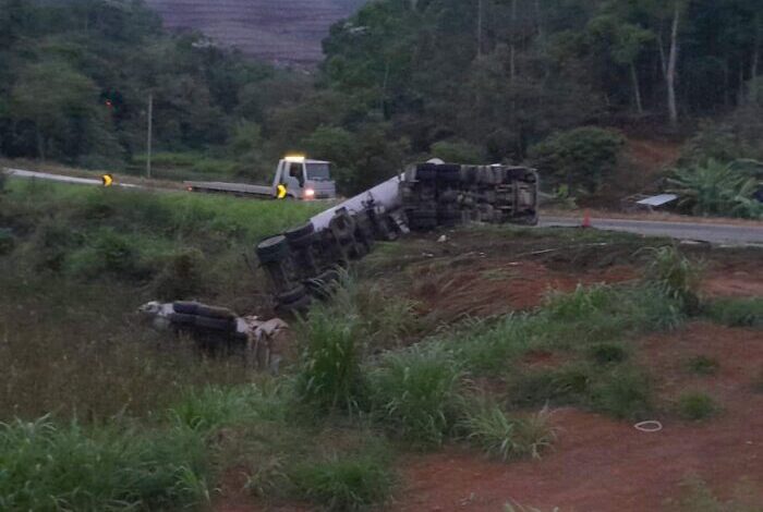 Carreta com leite tomba na BR-262 entre Manhuaçu e Realeza