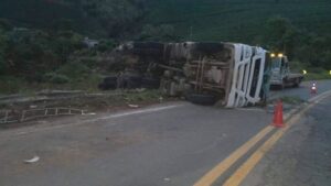 Uma carreta carregada de leite tombou na manhã desta terça-feira (25/11) no km 49 da BR-262, no trecho entre Manhuaçu e o distrito de Realeza.