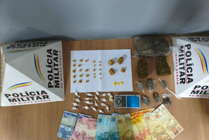 Foram apreendidas: três barras de maconha, seis buchas de maconha, 28 pedras de crack, 18 papelotes de cocaína, três pedaços de comprimido de êxtase, R$ 591,00 em dinheiro, um carregador de rádio comunicador, uma balança digital e uma faca.