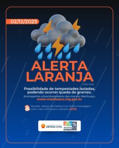 A Defesa Civil de Manhuaçu informa que o Inmet emitiu Alerta Laranja para esta terça-feira (02/12), com possibilidade de tempestades isoladas, fortes rajadas de vento e ocorrência de queda de granizo.