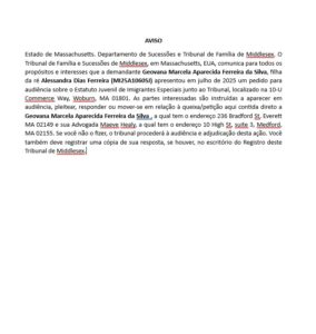 Estado de Massachusetts. Departamento de Sucessões e Tribunal de Família de Middlesex. O Tribunal de Família e Sucessões de Middlesex, em Massachusetts, EUA, comunica para todos os propósitos e interesses que a demandante Geovana Marcela Aparecida Ferreira da Silva, filha da ré Alessandra Dias Ferreira (MI25A1060SJ) apresentou em julho de 2025 um pedido para audiência sobre o Estatuto Juvenil de Imigrantes Especiais junto ao Tribunal, localizado na 10-U Commerce Way, Woburn, MA 01801. As partes interessadas são instruídas a aparecer em audiência, pleitear, responder ou mover-se em relação à queixa/petição aqui contida direto a Geovana Marcela Aparecida Ferreira da Silva , a qual tem o endereço 236 Bradford St, Everett MA 02149 e sua Advogada Maeve Healy, a qual tem o endereço 10 High St, suite 3, Medford, MA 02155. Se você não o fizer, o tribunal procederá à audiência e adjudicação desta ação. Você também deve registrar uma cópia de sua resposta, se houver, no escritório do Registro deste Tribunal de Middlesex.