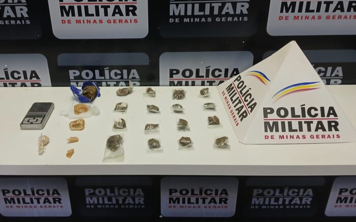 Após buscas, os militares localizaram e apreenderam um pedaço de barra de maconha, 16 buchas de maconha, quatro porções maiores de substância análoga ao crack, um invólucro contendo pedras fragmentadas de crack e uma balança digital.