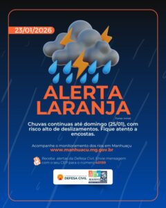 Alerta laranja para chuvas intensas e risco de deslizamentos e alagamentos em Manhuaçu até domingo (25)