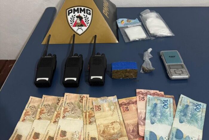 Em continuidade às diligências, foram realizadas buscas no imóvel do abordado, onde foram localizadas mais uma porção da mesma droga, uma balança de precisão, materiais utilizados para embalar drogas, três rádios comunicadores e a quantia de R$ 630,00 em dinheiro.