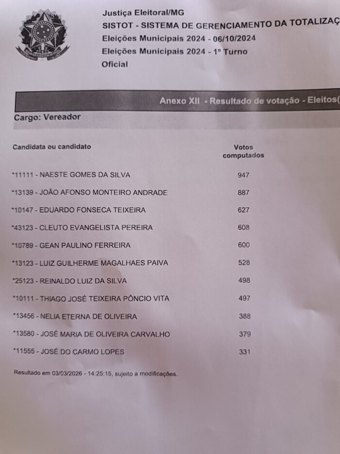 A composição da Câmara Municipal de Mutum foi oficialmente alterada após decisão definitiva da Justiça Eleitoral que determinou o reprocessamento (retotalização) dos votos das Eleições 2024 para o cargo de vereador.