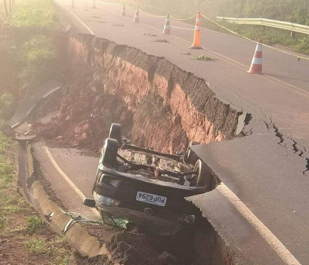 Asfalto cede e veículo fica pendurado em ribanceira